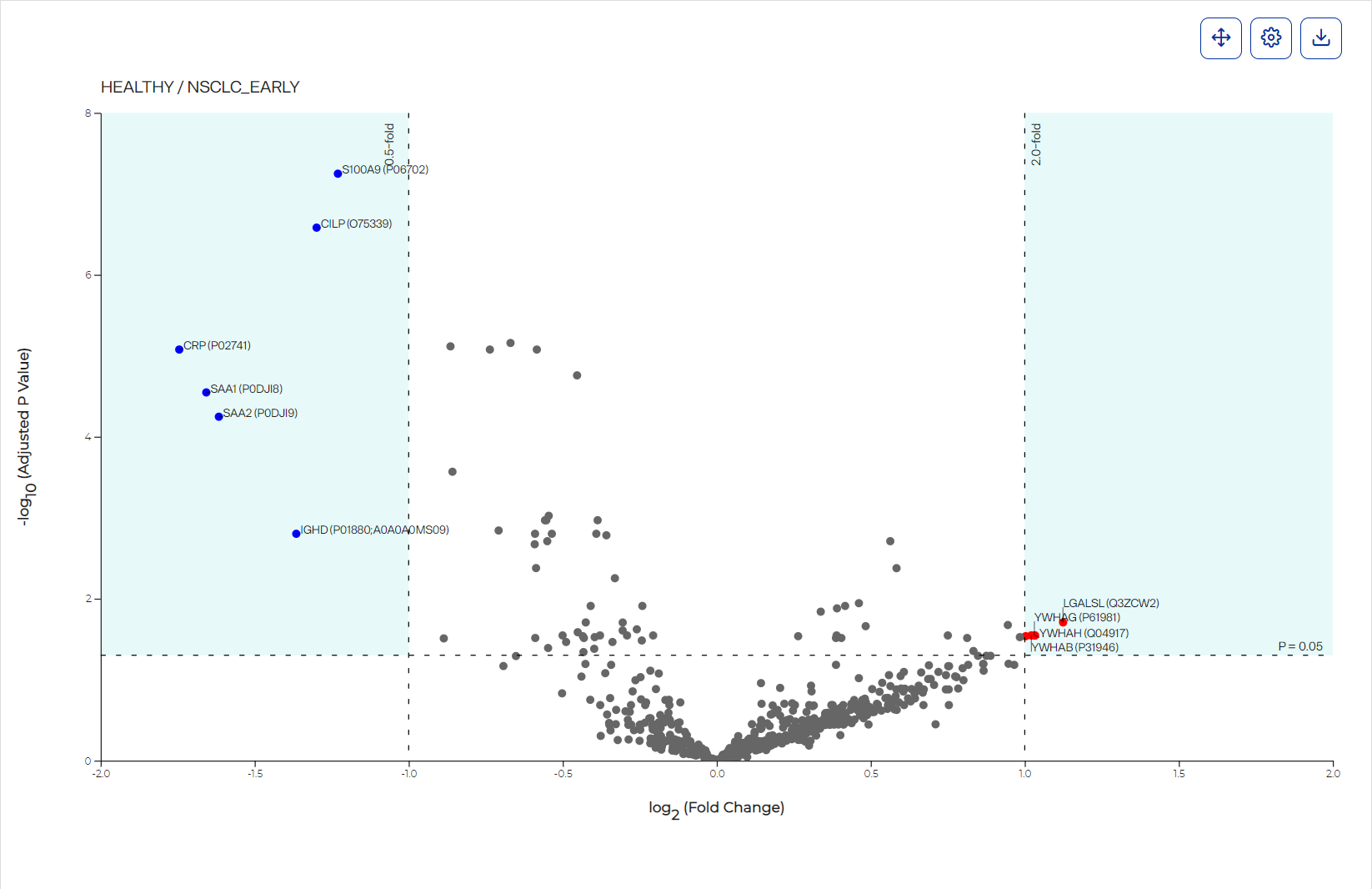 Here you can visualize a scatter plot showing the statistical significance (p-value) in abundance differences between your compared groups versus the magnitude of the change (Fold Change). Each point in the plot represents a protein or peptide. Highlighted in the teal quadrants are proteins with large fold changes (default: ±2) and statistically significant (default: p < 0.05). Data displayed in the plot are shown in detail in the table on the left of the plot.